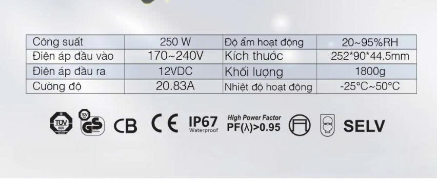 Hiệu suất sử dụng cao, chất lượng dòng điện đầu ra ổn định, giúp tăng cường tuổi thọ đèn LED, chuẩn bảo vệ thiết bị đạt IP67, chống nước, chống bụi tốt, các sản phẩm đều được kiểm tra đầy tải 100% trước khi xuất xưởng, cho chất lượng sử dụng ổn định. Đầy đủ các chức năng bảo vệ chống đoản mạch, chống quá tải.