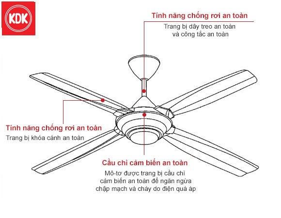 Thiết kế an toàn ngăn ngừa quạt rơi và Cầu chì an toàn nhiệt đề phòng, ngăn ngừa tăng quá nhiệt hoặc quá dòng điện.