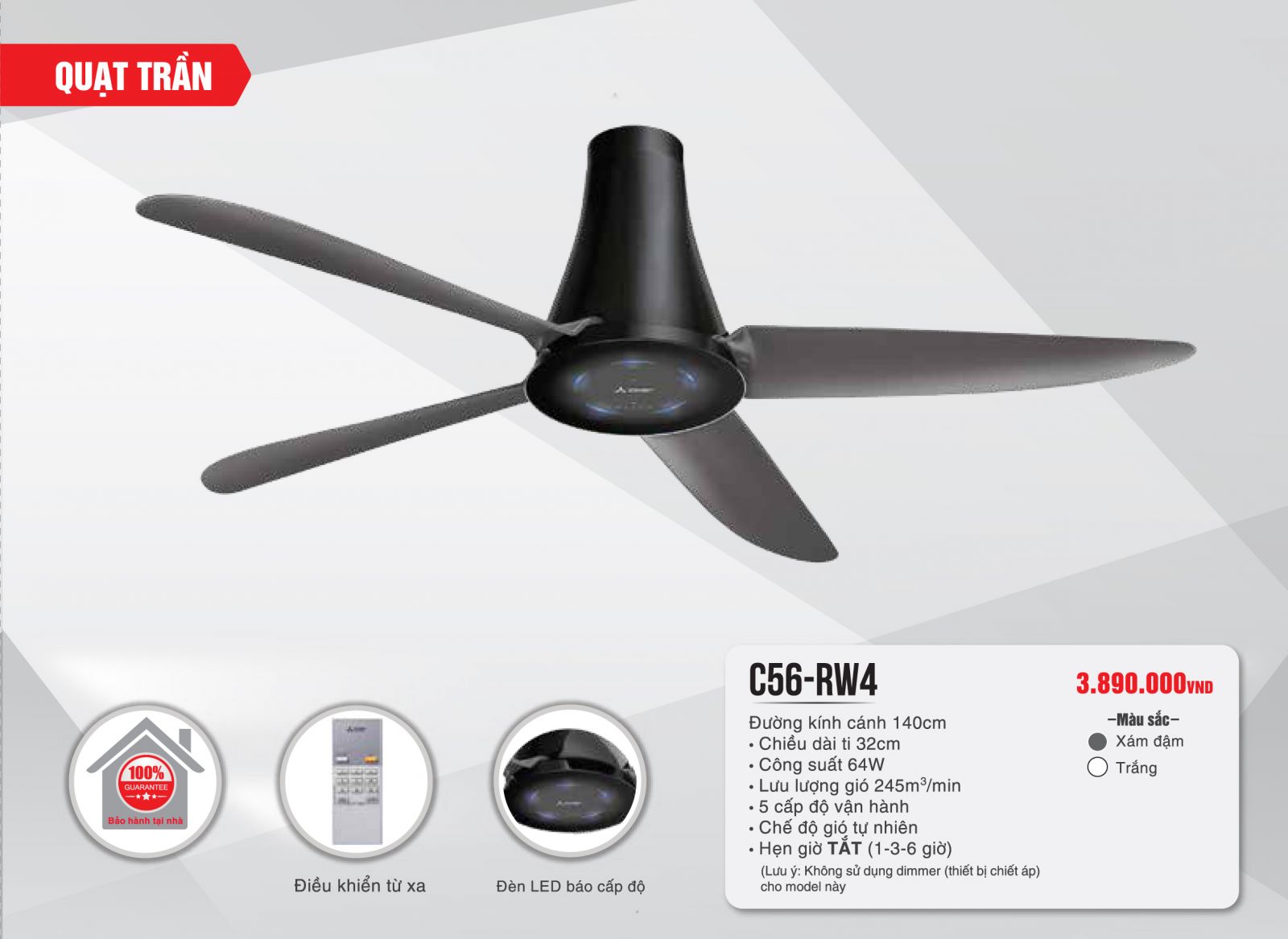 Quạt trần Mitsubishi C56-RW4 là một trong số những loại quạt trần của hãng điện tử Mitsubishi Electric áp dụng công nghệ chống rỉ sét cho cánh quạt bởi việc phủ lớp kim loại mạ lớp siêu bền chống ăn mòn cao nhất hiện nay. Quạt có 4 cánh thiết kế cong tạo độ gió luôn đều và sức lan tỏa rộng hơn và cũng tạo nên đường cong thẩm mỹ cho quạt trở nên sang trọng hơn, đây cũng được xem là nét nổi bật chỉ có riêng các thiết kế quạt trần Mitsubishi. Sản phẩm hướng đến thị phần người tiêu dùng thông thái với nhiều tính năng nổi trội so với các loại quạt trần thông thường hiện nay.