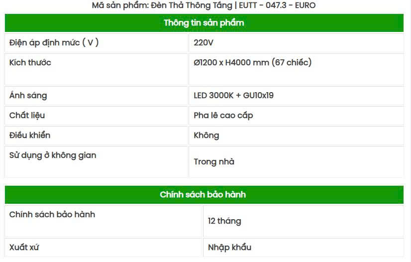 Đèn Thả Thông Tầng EURO đa dạng các họa tiết và hình ảnh mô phỏng tương thích với từng xu hướng phong cách thiết kế. Tại các khu vực đầy rẫy các đường thẳng, vuông vức và hình khối. Sự mềm mại của họa tiết kiểu cách, các nét cong lượn nghệ thuật thổi hồn cho sức hấp dẫn. Kiểu dáng thiên về hướng thanh thoát, nhẹ nhàng. Kết nối bền bỉ, vững chắc. Sản phẩm vì thế đảm bảo tối đa tính phối hợp cùng không gian nội thất. Trên thực tế, đèn hỗ trợ khả năng tạo sáng và trang trí rất hiệu quả. Đèn thả Luxury EURO được ứng dụng vào những không gian: biệt thự cao cấp, khách sạn 5 sao, …